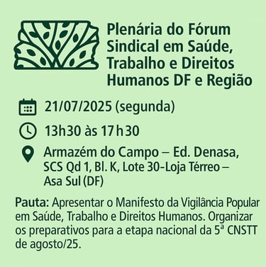 📢 No dia 21 de julho, das 13h30 âs 17h30, o Fórum Sindical Saúde, Trabalho e Direitos Humanos do DF e Entorno se reúne para apresentar seu Manifesto e alinhar os preparativos rumo à 5ª CNSTT